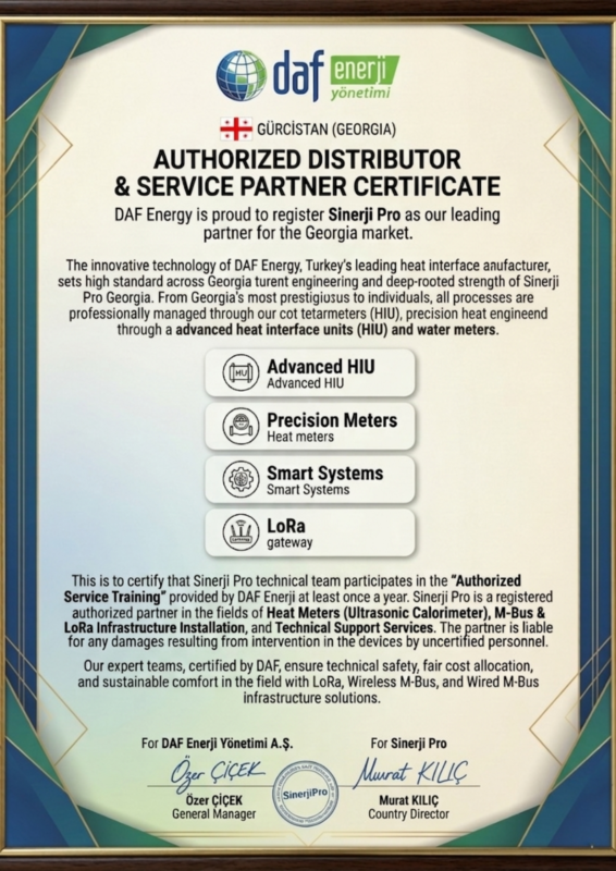 The innovative technology of DAF Energy, Turkey’s leading heat interface unit manufacturer, sets a high standard across Georgia combined with the expert engineering and deep-rooted service strength of Sinerji Pro Georgia. From Georgia’s most prestigious projects to individual residences, all processes are professionally managed through advanced heat interface units (HIU), precision heat and water meters, and integrated smart metering systems. Our expert teams, certified by DAF, ensure technical safety, fair cost allocation, and sustainable comfort at every point in the field with LoRa, Wireless M-Bus, and Wired M-Bus infrastructure solutions.